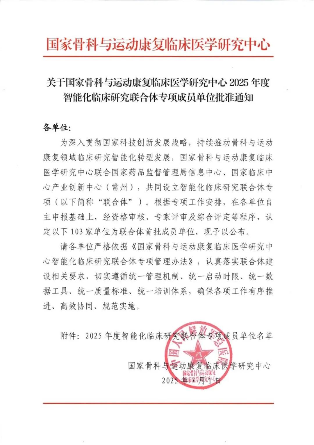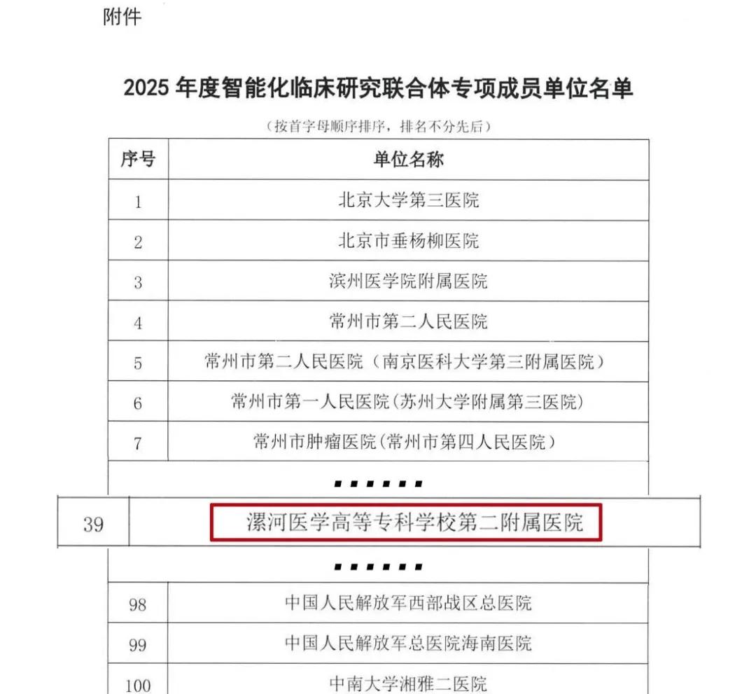 由國家骨科與運(yùn)動康復(fù)臨床醫(yī)學(xué)研究中心(以下簡稱“國家臨床中心”)聯(lián)合國家藥品監(jiān)督管理局信息中心、國家臨床中心產(chǎn)業(yè)創(chuàng)新中心(常州)共同設(shè)立的“2025年度智能化臨床研究聯(lián)合體專項(xiàng)”已完成首批成員單位遴選,共103家單位成功入選(具體名單見文末附件),覆蓋全國26個(gè)省份。 其中漯河醫(yī)專二附院成功入選國家臨床中心“智能化臨床研究聯(lián)合體專項(xiàng)”首批成員單位