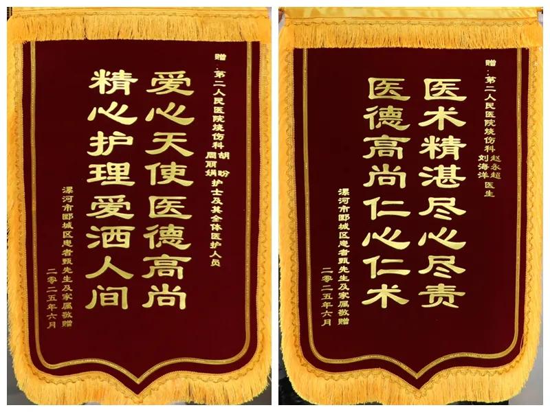 住院的日子里,每一天都讓患者感受到溫暖,每一名醫(yī)生,每一名護(hù)士,都讓他難忘。在出院時(shí),患者及家屬激動(dòng)不已:“沒想到我會(huì)恢復(fù)這么快,感謝你們的精湛醫(yī)術(shù),是你們給了我第二次生命!”為表示感謝,患者特地囑托身在外地的兒子定制了兩面錦旗,送至科室醫(yī)護(hù)手中。