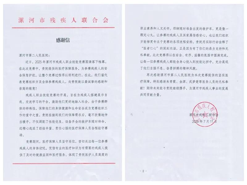 近日,市二院收到一封來自市殘聯(lián)發(fā)來的感謝信。信中高度贊譽醫(yī)院在2025年全市殘疾人職業(yè)技能競賽期間提供的全方位醫(yī)療保障服務(wù),稱其“用實際行動詮釋醫(yī)者仁心,為賽事筑起堅實的安全防線。”