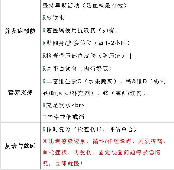 骨折術(shù)后拆線前的階段(通常為術(shù)后7-14天)是傷口愈合和早期穩(wěn)定的關(guān)鍵時(shí)期,特別是未拆線出院的患者做好自我防護(hù)至關(guān)重要,能有效預(yù)防感染、促進(jìn)愈合、避免并發(fā)癥。以下是詳細(xì)的自我防護(hù)清單: