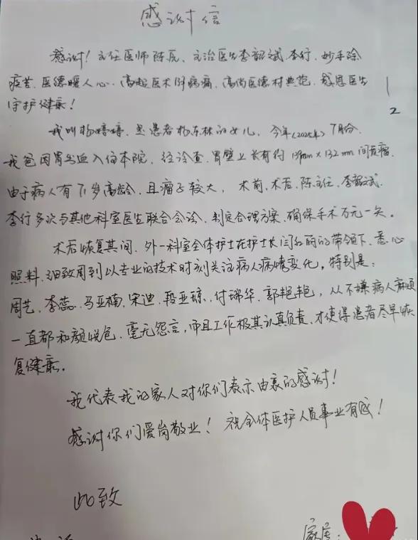 這封感謝信,是對普通外科全體醫(yī)護(hù)人員,尤其是對護(hù)理團(tuán)隊辛勤付出和專業(yè)精神的高度認(rèn)可與鼓勵。對團(tuán)隊而言,患者的康復(fù)和家屬的滿意是他們最大的追求。普通外科團(tuán)隊將繼續(xù)秉承“以患者為中心”的服務(wù)理念,不斷精進(jìn)醫(yī)療技術(shù),提升護(hù)理服務(wù)質(zhì)量,尤其是加強復(fù)雜、高齡患者圍手術(shù)期的精細(xì)化、人性化護(hù)理管理,用精湛的醫(yī)術(shù)祛除病痛,用溫暖的仁心守護(hù)健康,為更多患者帶來康復(fù)的希望和家的溫暖。(盧 闖 閆紅麗 劉 旭 袁錦鈺)