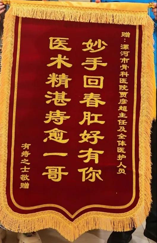 近日,漯河醫(yī)專二附院(漯河市骨科醫(yī)院、漯河市立醫(yī)院)肛腸科收到一面滿載心意的錦旗?;颊呶罩Z彥超主任的手再三致謝,錦旗上“妙手回春肛好有你,醫(yī)術精湛痔愈一哥”十六個大字,既是對醫(yī)護人員專業(yè)能力的肯定,更是對肛腸科中西醫(yī)結合診療水平的認可。