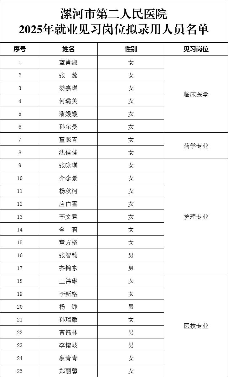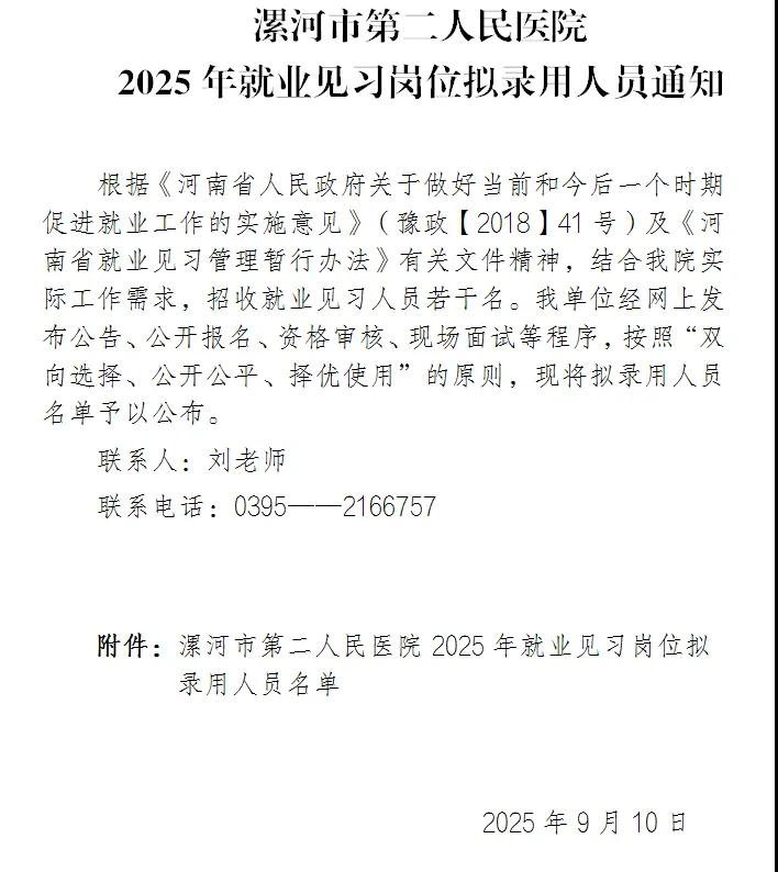 【公示】漯河市第二人民醫(yī)院2025年就業(yè)見習崗位擬錄用人員通知