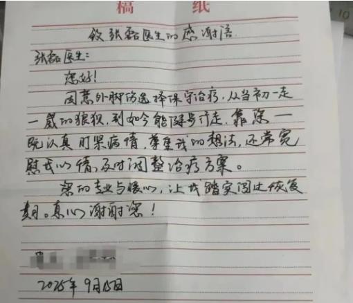 就這樣,在專業(yè)治療與耐心陪伴下,患者的腳踝一天天好轉(zhuǎn):從最初只能緩慢行走,到后來(lái)能正常上下樓梯,再到如今可以輕松散步——曾經(jīng)讓患者困擾不已的“老大難”問題,終于徹底解決。出院那天,患者特意手寫了這封感謝信,字里行間滿是真誠(chéng):“張醫(yī)生不僅治好了我的疼痛,更撫平了我心里的焦慮,這樣的好醫(yī)生,值得我們真心感謝!”