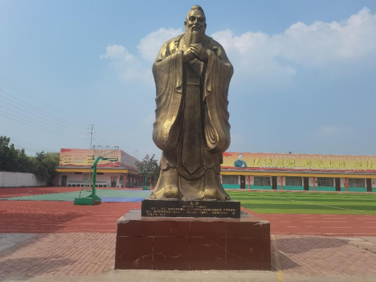 孔子巨大的木雕塑像,以“仁義禮智信”的姿態(tài)歡迎我們。兩側(cè)的敬老愛幼的典故雕像,以及習(xí)近平總書記的金句摘錄、歷代先賢的勵(lì)志名言,構(gòu)成了一個(gè)別具意味的氛圍。