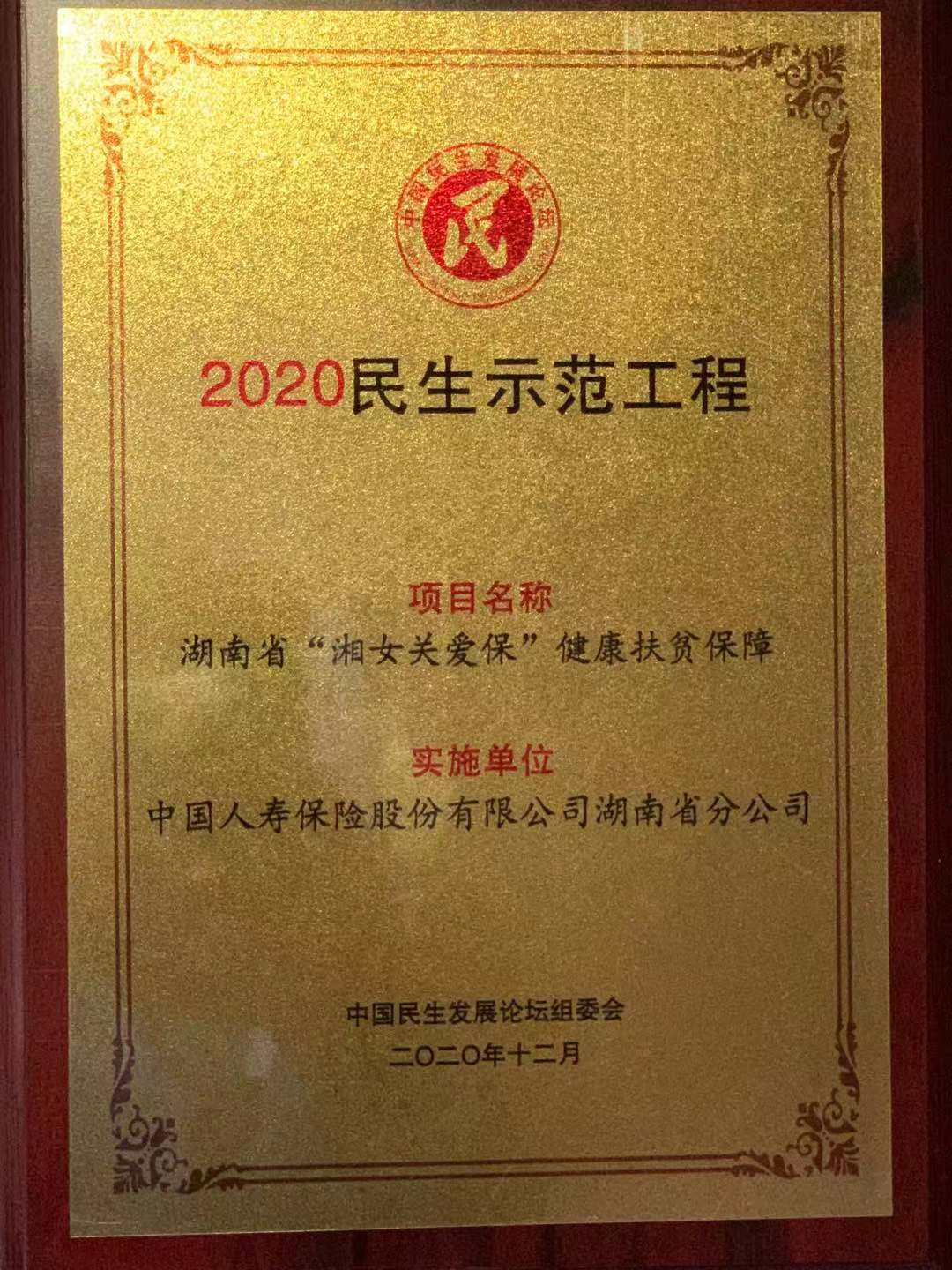 湖南“湘女關(guān)愛保”健康扶貧保障榮獲2020年度“民生示范工程”獎