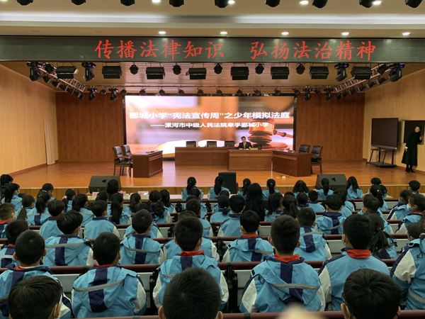 模擬法庭前,漯河市中級人民法院少年審判庭庭長王建對少年法庭工作和庭審流程進(jìn)行了介紹;200余名師生共同觀看了漯河市中級人民法院制作、郾城區(qū)小學(xué)學(xué)生參與演出的微電影《桃花依舊笑春風(fēng)》。