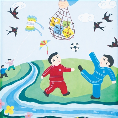 (記者 尹曉玉)藍(lán)天白云下,幾名孩子在歡樂地踢足球、放風(fēng)箏,畫面和諧美好。在孩子們的頭頂,一雙大手將色情、迷信、暴力書籍收入網(wǎng)中……這是舞陽農(nóng)民畫家梁素平的“護(hù)苗”主題作品《收網(wǎng)》。近日,44幅以“護(hù)苗”為主題的舞陽農(nóng)民畫,在中宣部辦公區(qū)一樓大廳展出。這些作品色彩艷麗、寓意深刻,既有鮮明的時代特點和豐富的文化內(nèi)涵,又使“掃黃打非”宣傳工作有了更生動、更接地氣的表達(dá)。