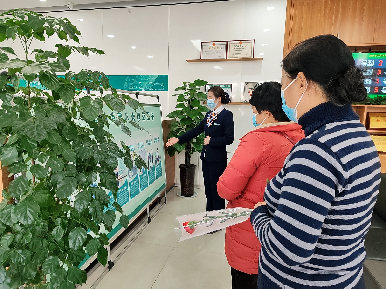 活動當天營業(yè)廳為到場的女性客戶獻上康乃馨,表達節(jié)日的問候和祝?!,F(xiàn)場推出了消保知識競猜活動,參加活動的客戶從鮮花墻上抽題答題并贈送了禮品,不僅活躍了節(jié)日氣氛,又為客戶普及了金融消費者權(quán)益知識,提高客戶風險防范意識。