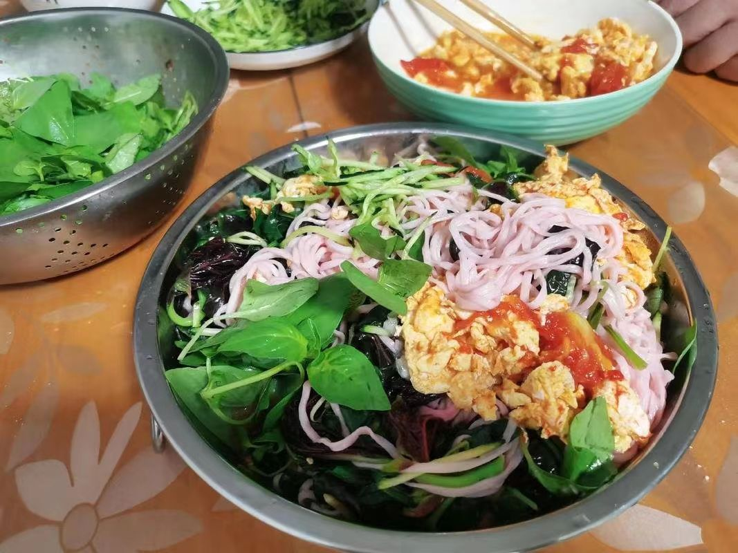 蒜香是源匯夏日的靈魂印記。紫皮蒜瓣剝落時迸濺汁液,辣意鉆入指甲縫,這是味覺蘇醒的前奏。粗陶蒜臼穩(wěn)踞灶臺,石錘起落間,蒜粒與青鹽漸成乳白脂膏。此時,十香菜翩然而至——這種被《神農(nóng)本草經(jīng)》記載的香草,在漯河人陽臺的泡沫箱里蓬勃生長,葉片揉碎時散發(fā)薄荷與檸檬交織的清氣。