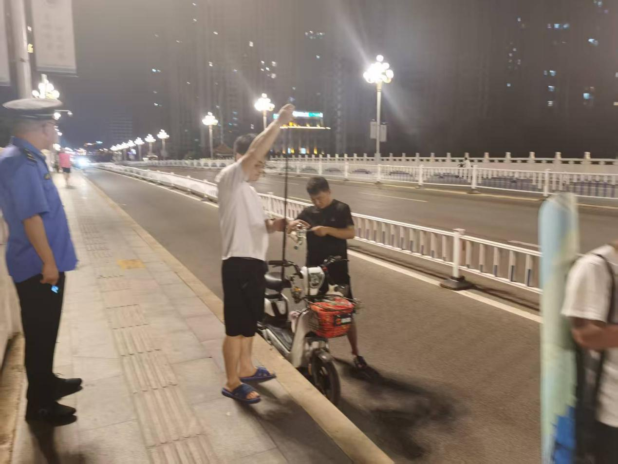 “晚上橋面光線不好,來回過往的行人和非機動車輛也多,您在這兒垂釣實在是不安全啊,趕快收竿回家吧。”8月3日20時許,在漯河市金山路沙河橋上,經開區(qū)城市管理綜合行政執(zhí)法大隊大隊長曹陽帶領夜間執(zhí)法人員在轄區(qū)范圍內開展橋面垂釣治理行動。