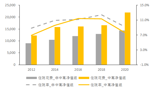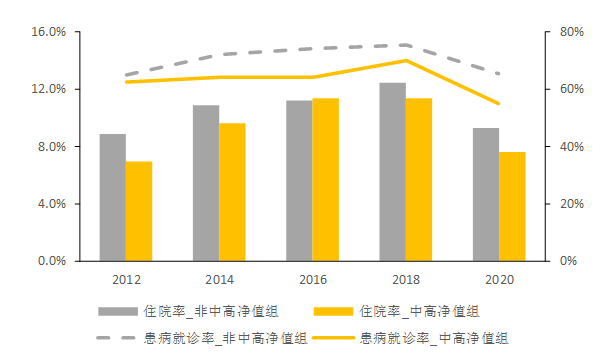 白皮書(shū)顯示,中高凈值人群的住院率和患病就診率均低于非中高凈值人群,醫(yī)療資源使用頻率偏低。與之相對(duì),中高凈值人群的住院費(fèi)用及年度家庭醫(yī)療總開(kāi)支卻明顯更高,這意味著其在使用醫(yī)療服務(wù)資源時(shí)追求更高層次的服務(wù)需求。