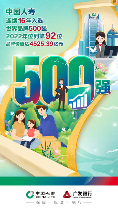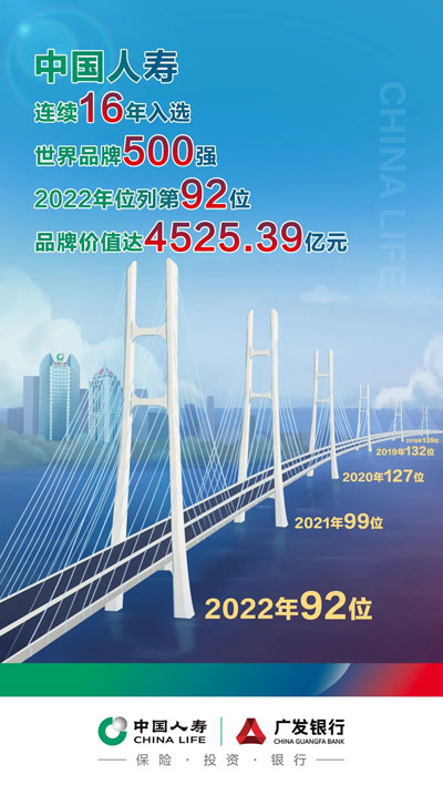 中國人壽已經(jīng)連續(xù)20年入選《財富》世界500強排行榜,2022年位列第40位。根據(jù)世界品牌實驗室發(fā)布的2022年“中國500最具價值品牌榜單”,中國人壽品牌價值高達人民幣4525.39億元,在中國保險行業(yè)中蟬聯(lián)第一。