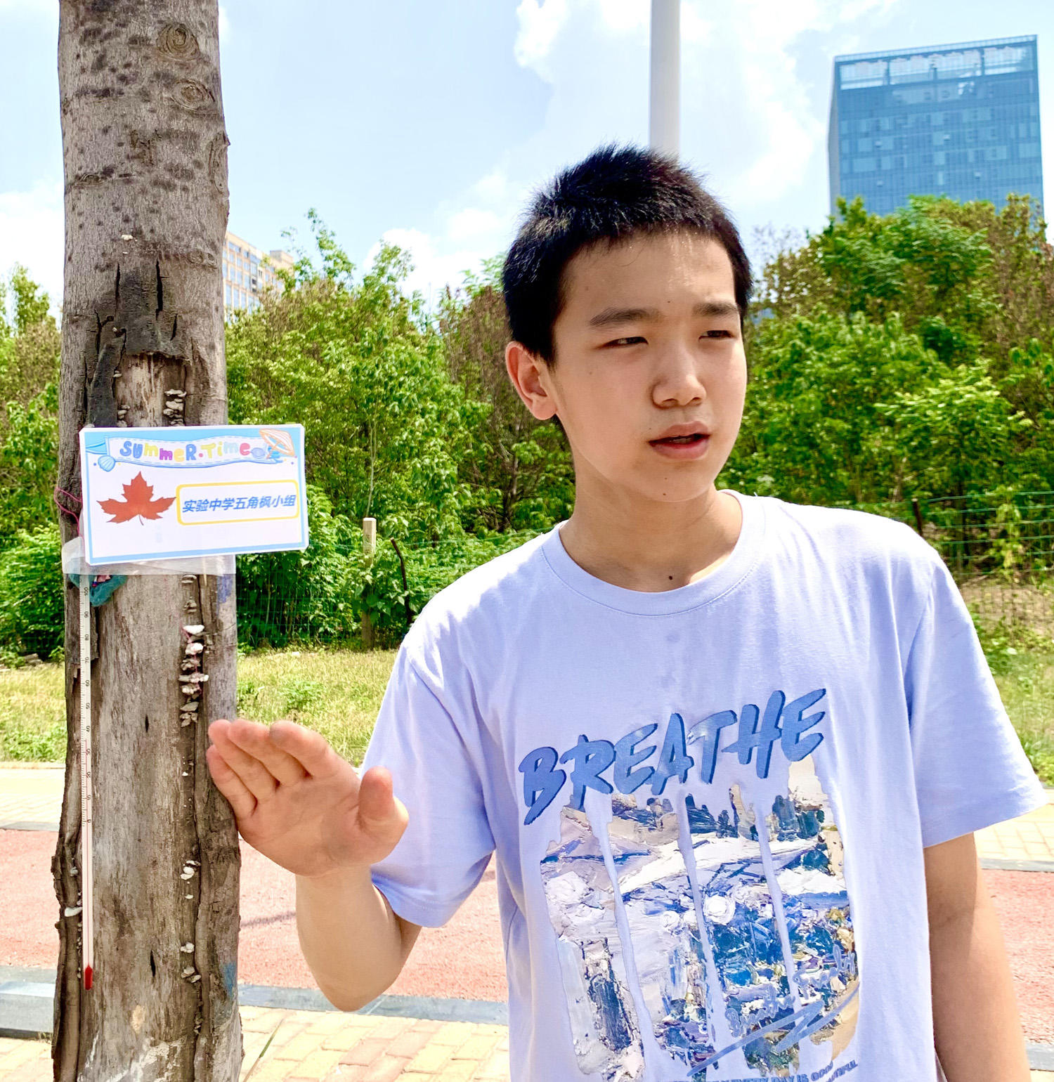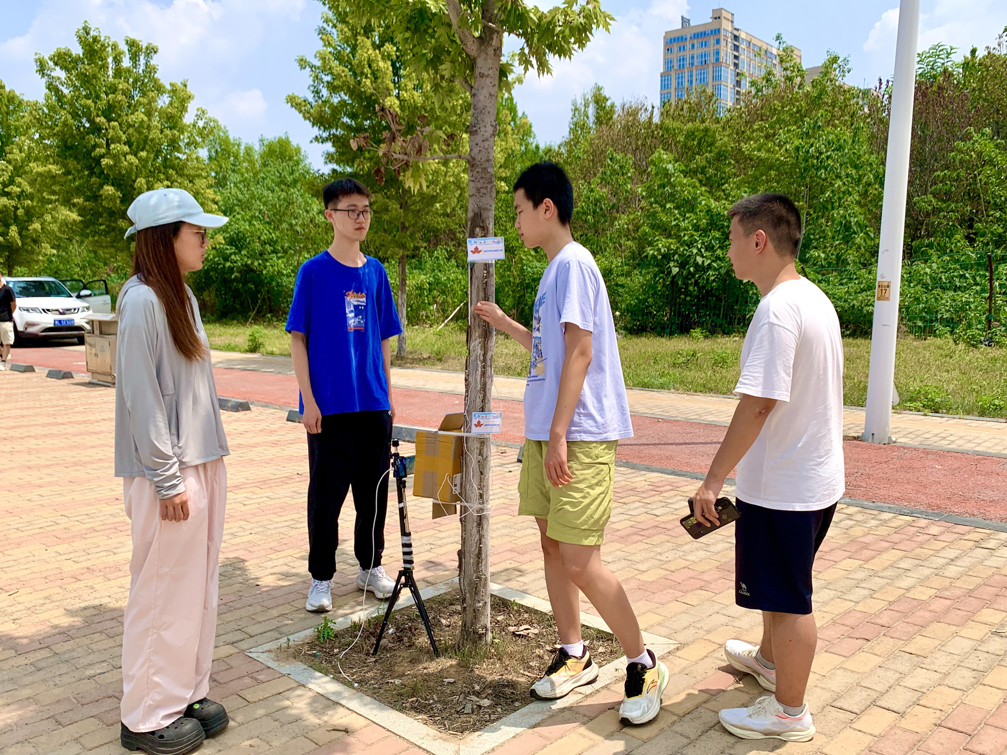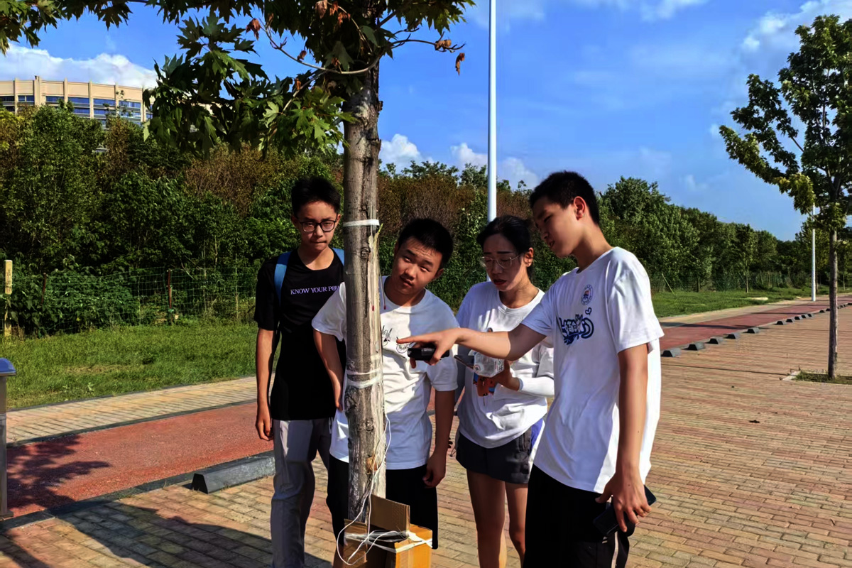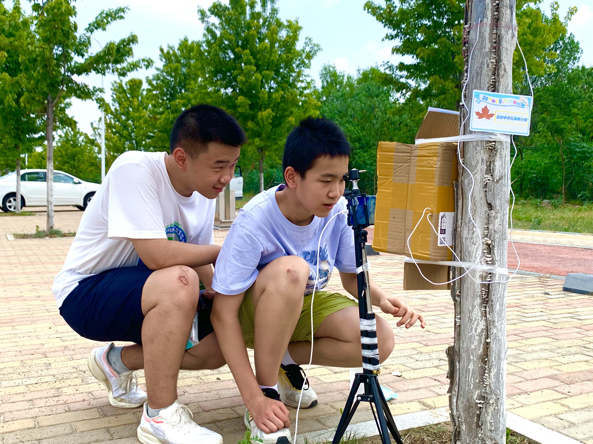 7月18日午時(shí),西城凌云山路,40℃的高溫炙烤著大地。在炎炎烈日下,兩個(gè)稚嫩的少年正蹲在一棵小樹前,手里拿著儀器,專注地觀察著什么。刺眼而毒辣的陽光灑在他們的身上,他們卻仿佛感覺不到炎熱與不適。