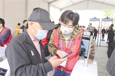 在會(huì)場入口處,志愿者向市民講解如何使用手機(jī)進(jìn)場。