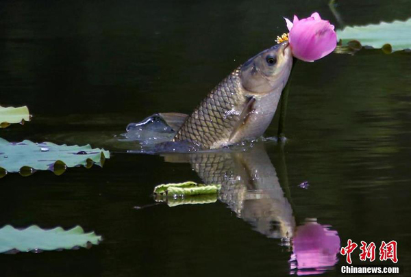 成都一荷塘現(xiàn)“魚吃荷花”景觀
