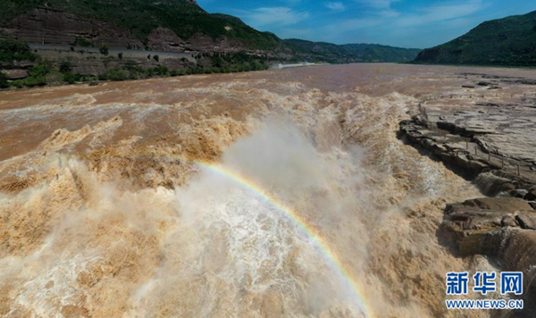 7月7日,黃河壺口瀑布主瀑上出現(xiàn)彩虹(無人機照片)。 近日,位于秦晉大峽谷的黃河壺口瀑布出現(xiàn)難得一見的“金色瀑布”景觀。 新華社記者 陶明 攝