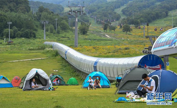這是7月19日拍攝的吉林市萬科松花湖度假區(qū)的露營地。 夏日時節(jié),吉林省吉林市的萬科松花湖度假區(qū)利用滑雪場的地形優(yōu)勢,增添了高山花海、彩虹滑道等休閑旅游項目,吸引游客前來觀光游覽。 新華社發(fā)(顏麟蘊攝)
