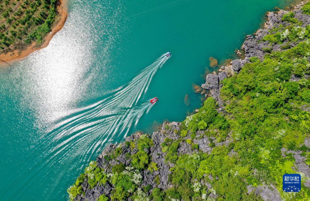 4月21日,在湖南省永州市道縣壽雁鎮(zhèn)樂海水庫,護(hù)水志愿者乘坐快艇進(jìn)行水上巡查作業(yè)(無人機(jī)照片)。