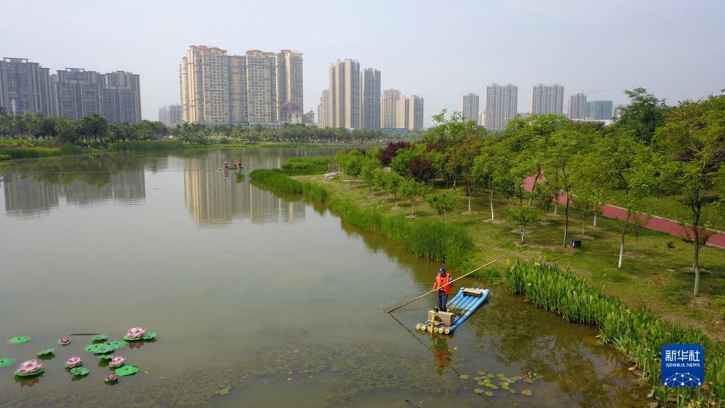4月21日,環(huán)衛(wèi)工人在廣西賀州市愛蓮湖公園劃乘小船清理湖面漂浮物(無人機(jī)照片)。