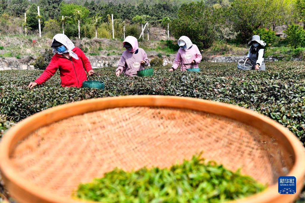 4月21日,在日照市東港區(qū)日照街道茶葉基地,茶農(nóng)在采摘春茶。