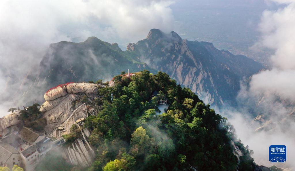云霧縹緲的華山西峰(4月28日攝,無人機(jī)照片)。