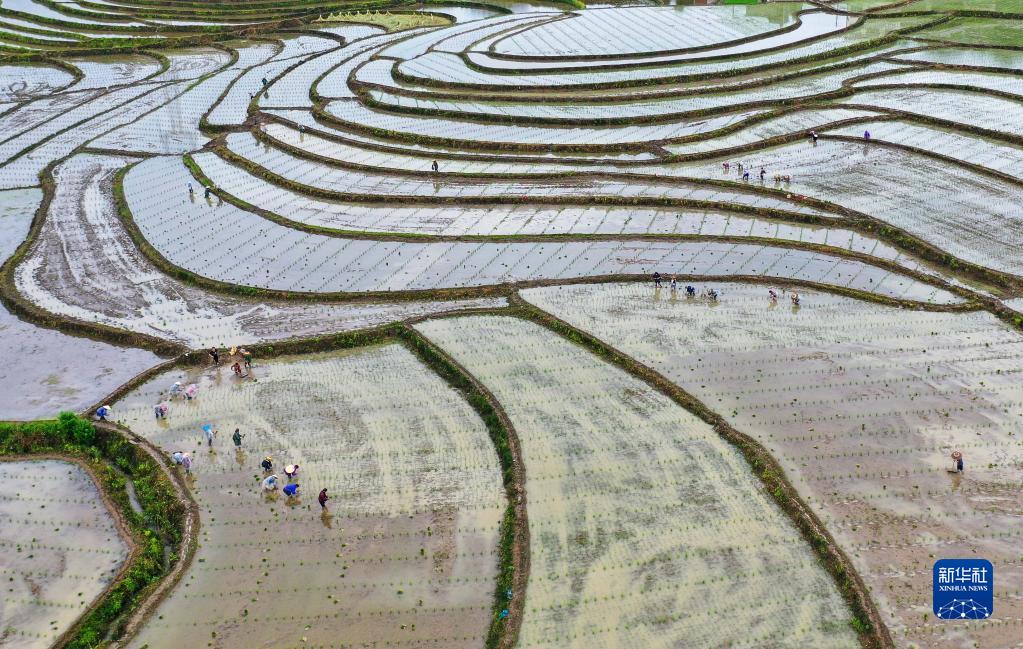 5月10日,農(nóng)民在重慶市酉陽土家族苗族自治縣涂市鎮(zhèn)大杉村稻田中勞作(無人機照片)。