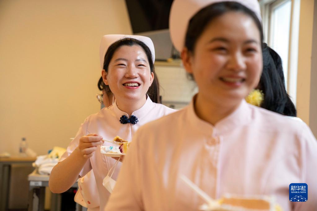 5月11日,在北京按摩醫(yī)院舉行的國際護(hù)士節(jié)慶?;顒?dòng)上,醫(yī)護(hù)人員吃蛋糕。