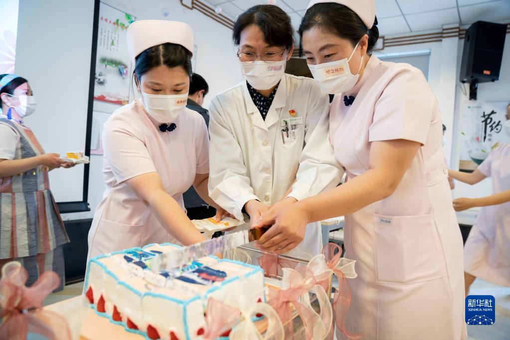 5月11日,在北京按摩醫(yī)院舉行的國際護(hù)士節(jié)慶?;顒?dòng)上,醫(yī)護(hù)人員切蛋糕。