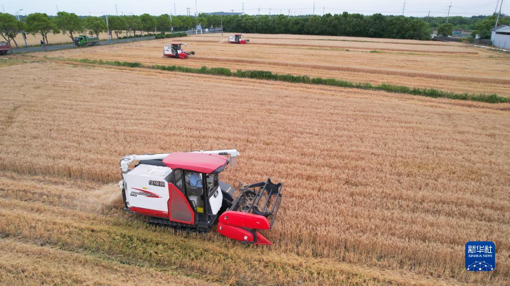 5月23日,在江蘇省太倉市璜涇鎮(zhèn)雅鹿村,農(nóng)民駕駛收割機搶收小麥(無人機照片)。
