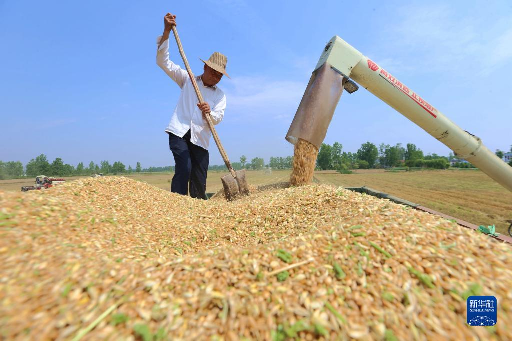 5月24日,在湖北襄陽棗陽市吳店鎮(zhèn)肖灣村,村民在田間收獲小麥。