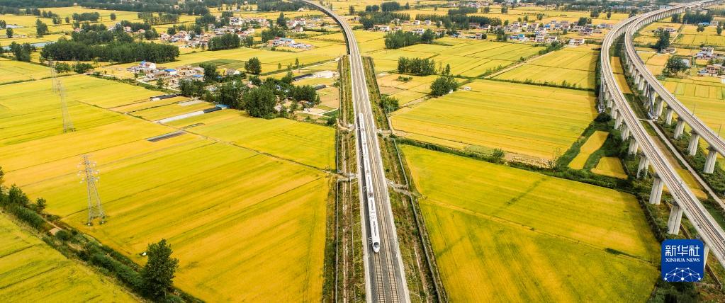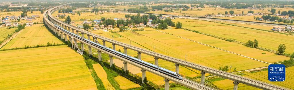 5月26日,一列高鐵列車駛過江蘇淮安即將豐收的麥田(無人機拍攝)。