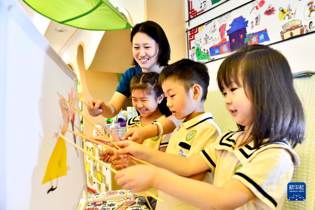 5月30日,在山東省實(shí)驗(yàn)幼兒園,老師帶著孩子們體驗(yàn)皮影戲。新華社記者 郭緒雷 攝