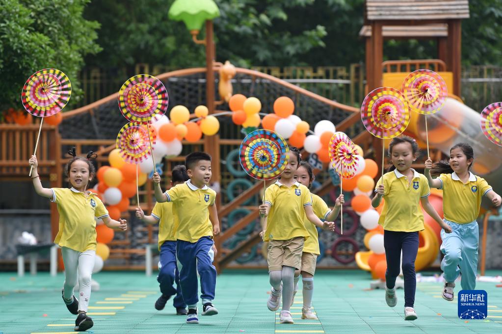 6月1日,江蘇南京建鄴區(qū)金地名京幼兒園的小朋友手持風(fēng)車歡慶節(jié)日。