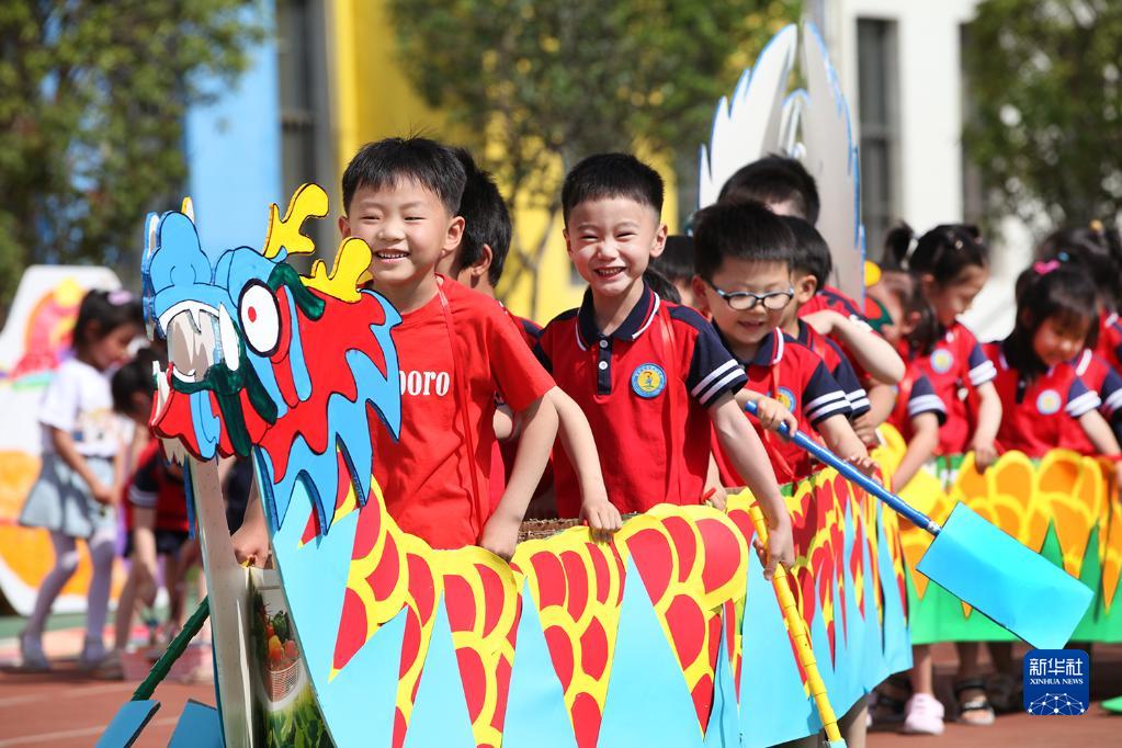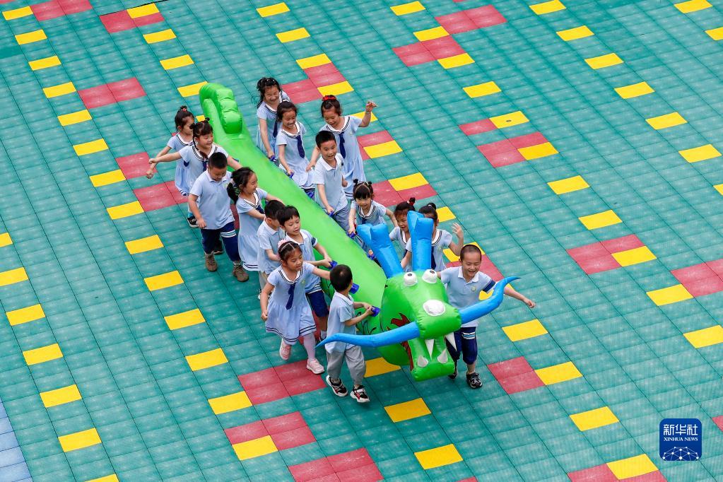 6月1日,安徽省黃山市屯溪區(qū)示范幼兒園的小朋友在“龍舟賽”游戲中開心玩耍。