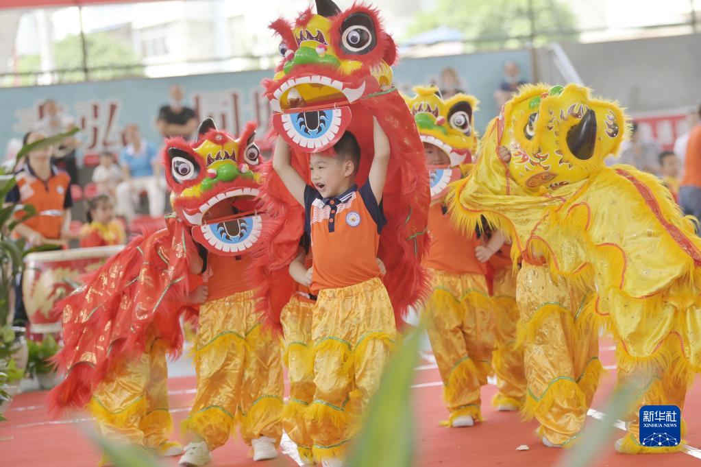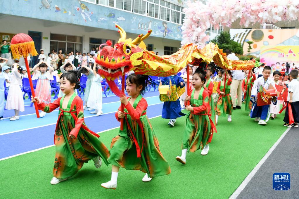 6月1日,小朋友在安徽省銅陵市楊家山幼兒園表演龍燈。