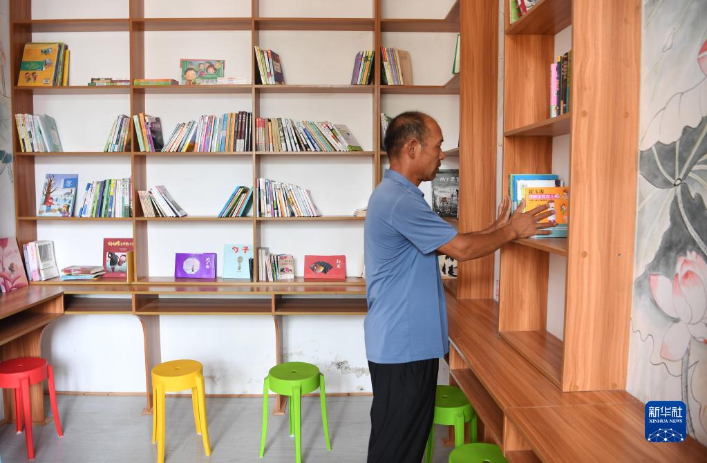 7月27日,在河南新鄉(xiāng)長垣市丁欒鎮(zhèn)官路西村,管理員在農(nóng)家書屋整理書籍。