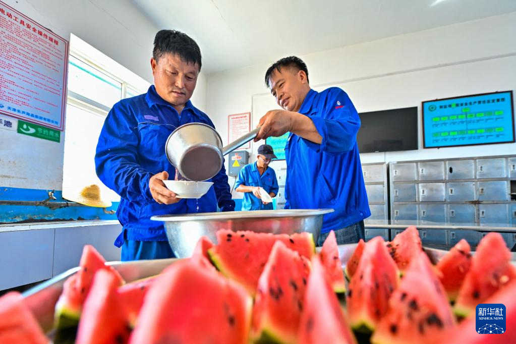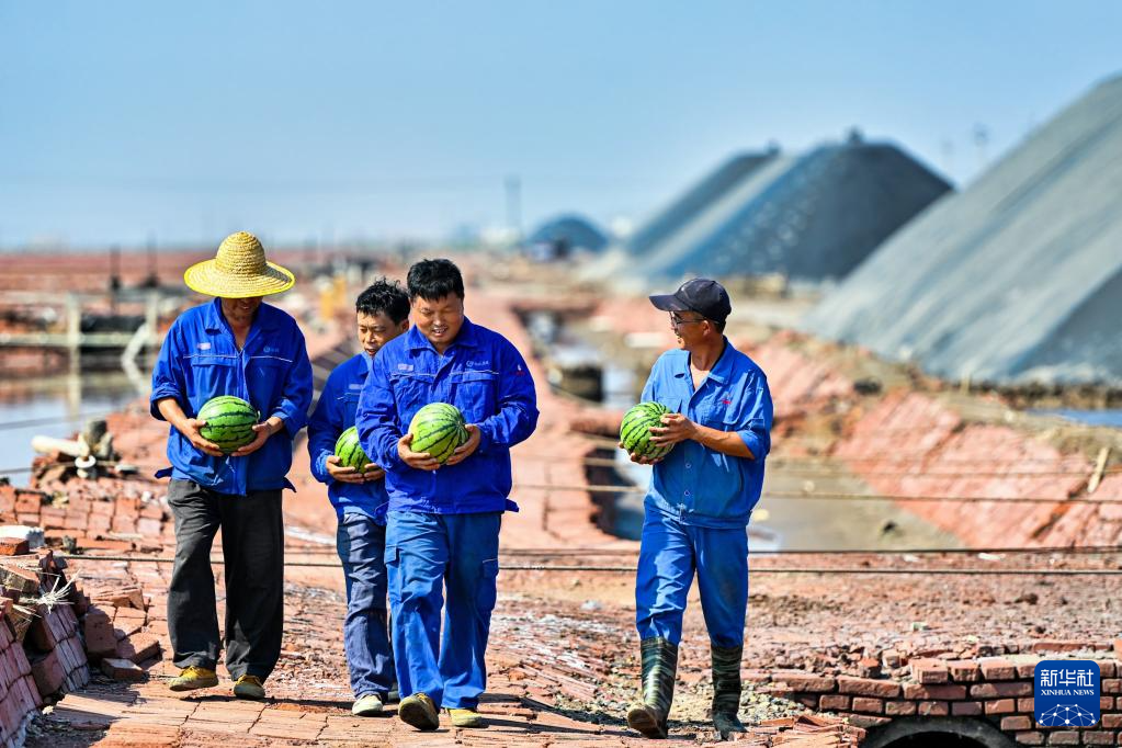 7月13日,在天津長蘆海晶集團(tuán)有限公司的鹽田作業(yè)現(xiàn)場,工人領(lǐng)取西瓜。