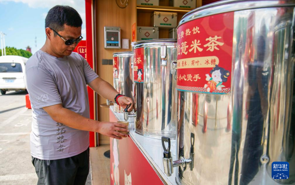 7月13日,游客在河北省豐南區(qū)河頭老街景區(qū)暖心驛站享受免費(fèi)飲品。