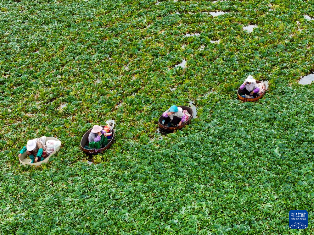 8月7日,江蘇省泰州市海陵區(qū)蘇陳鎮(zhèn)張家院社區(qū)農(nóng)民在菱塘采摘菱角(無人機(jī)照片)。