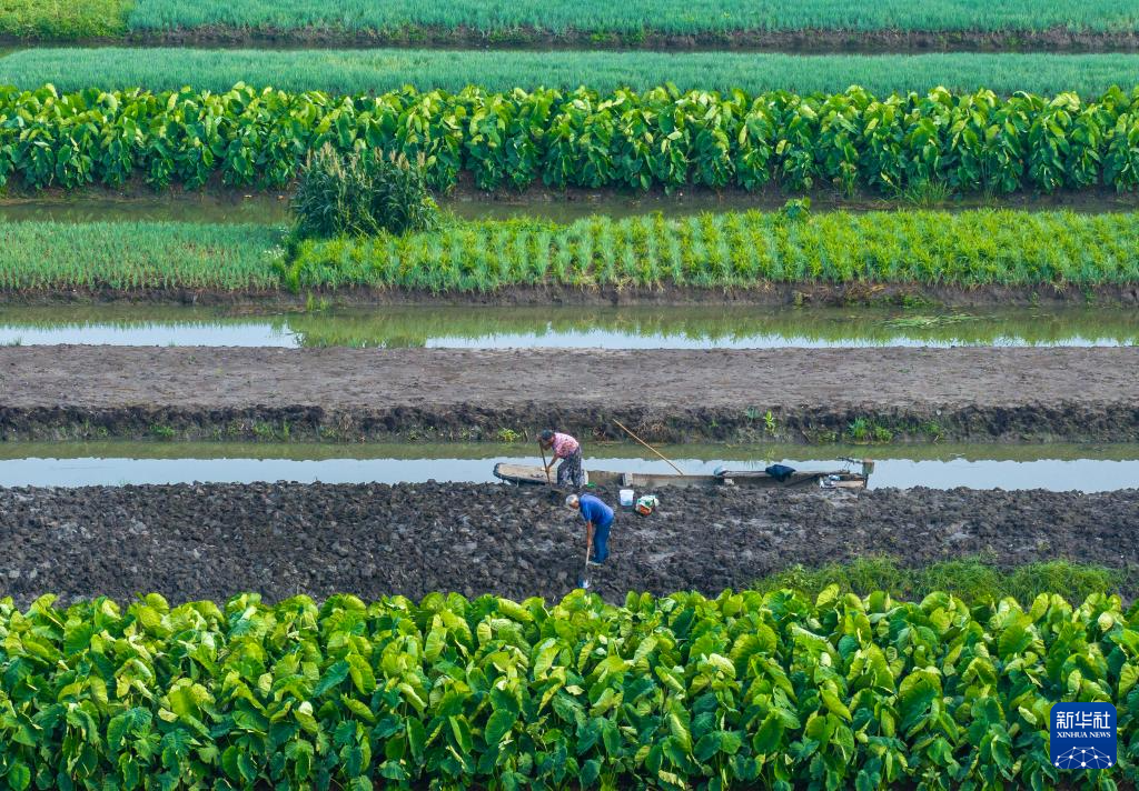 8月7日,農(nóng)民在江蘇省興化市垛田街道高家蕩村的田間勞作(無人機(jī)照片)。