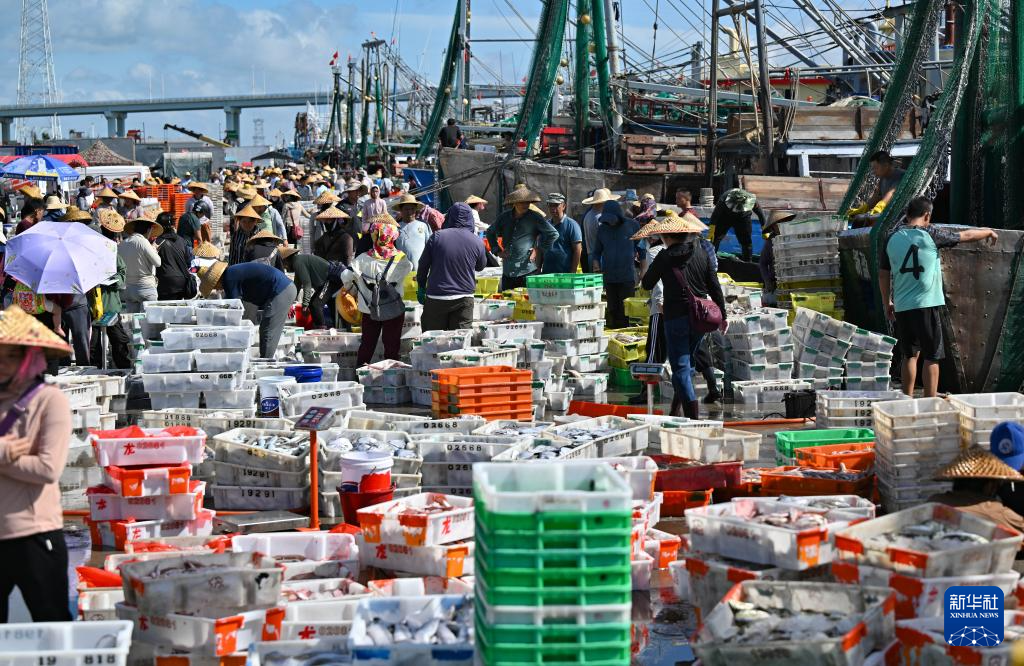 8月21日,在海南省文昌市清瀾漁港碼頭,漁民和商販在卸貨、交易。