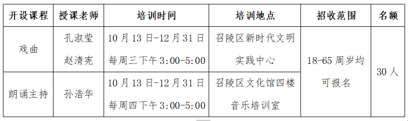 1.報(bào)名時(shí)間為9月15日至9月19日,有意參加培訓(xùn)的人員,請(qǐng)攜帶本人有效身份證復(fù)印件1張、近期2寸照片1張前往召陵區(qū)文化館辦公室(召陵區(qū)汾河路與祥云路交叉口東南角4樓)報(bào)名,電話報(bào)名無(wú)效,需本人現(xiàn)場(chǎng)報(bào)名,代替報(bào)名無(wú)效,名額有限,報(bào)滿(mǎn)截止;報(bào)名結(jié)束后,報(bào)名人數(shù)不滿(mǎn)70%,則取消該班。培訓(xùn)時(shí)間為10月13日至12月31日。